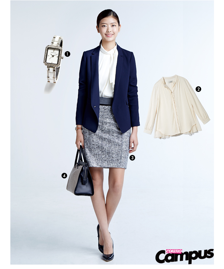2. 각 잡힌 칼라의 화이트 셔츠도 좋지만 여성스럽고 부드러운 인상을 주려면 크림 컬러나 베이비 핑크 등 파스텔 계열의 블라우스를 고르자. 단, 단추가 너무 많거나 지퍼 디테일이 심한 상의는 피하는 것이 좋다. 46만5천원 마인.