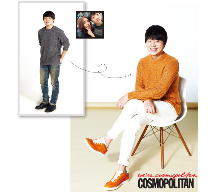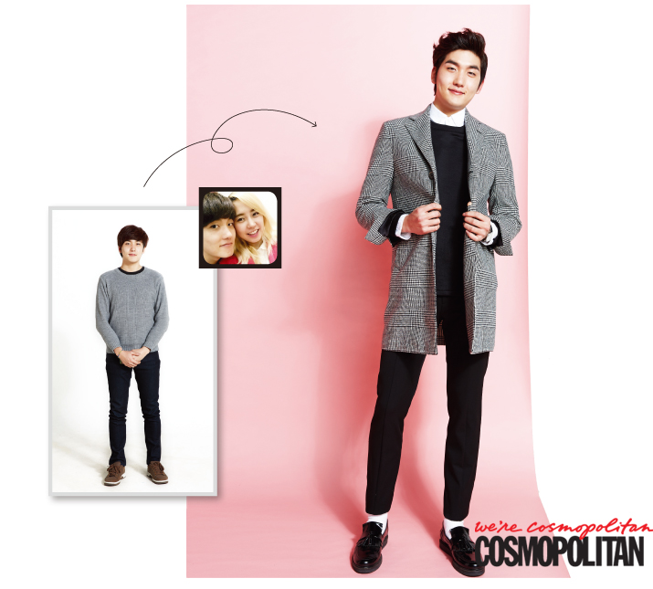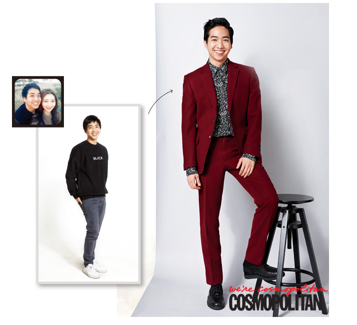 “여자 친구가 스타일에 대해 자주 조언하는 편이라 코스모의 이벤트에 뽑혔다고 했을 때 크게 놀라진 않았어요.” 옹브레 헤어스타일에 핑크색 코트를 입은 화사한 여자 친구와 달리 그는 심플한 니트 톱에 면바지를 입은 평범한 모습이었다. 먼저 헤어 스타일리스트 장해인이 그의 헤어스타일에 대해 찬찬히 살폈다. “곱슬머리에 숱이 많은 분들은 이마를 드러내는 것만으로도 인상이 훨씬 밝아 보여요. 옆머리와 뒷머리는 젤을 사용해 최대한 붙이고 드라이어를 이용해 앞머리를 자연스럽게 뒤로 넘기는 거죠.” 헤어스타일만 살짝 달라졌을 뿐인데 이렇게 시원시원한 인상으로 바뀌다니! 활짝 웃는 여자 친구와 함께 스타일리스트가 의상을 준비한 곳으로 이동했다. “사실 쇼핑을 자주 하는 남자는 많지 않죠. 대신 기본 아이템을 잘만 활용하면 다양한 스타일을 즐길 수 있어요. 화이트 셔츠에 스 셔츠를 겹쳐 입고 블랙 팬츠를 매치하는 식으로 말이죠. 좀 더 트렌디해 보이고 싶다면 요즘 유행하는 양말 포인트에 도전해보세요. 양말이 살짝 보일 정도로 바지 길이를 조절하면 다리가 훨씬 길고 슬림해 보인답니다.”