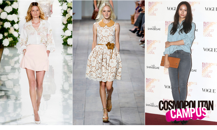 남녀 모두에게 가장 큰 지지를 얻은 룩! 실패 확률이 제일 낮은, 안전한 착장이라 하겠다. 모노톤블라우스에 플라워 패턴 스커트를 매치하거나 파스텔 컬러의 아이템을 선택해 상냥함을 연출하자.