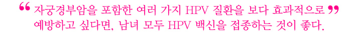 자궁경부암의 주요 원인으로 알려진 인유두종 바이러스(이하 HPV)는 약 190여 종 이상이 존재한다. 이 중 16형과 18형이 자궁경부암 환자에게서 약 70%가량 빈번하게 발견된다. 대한부인종양학회가 18세에서 79세 사이 우리나라 여성 6775명을 대상으로 조사한 결과, 34.2%가 HPV에 감염되어 있었으며 감염자의 절반가량이 18세에서 29세 사이에 나타났다고 밝혔다. 그런데 HPV는 여성에게만 나타나는 것이 아니다. 성인 남성의 감염률도 10%나 된다는 사실. 이렇게 남녀가 일생 동안 HPV에 감염될 확률은 무려 75~80%라고 한다. 다시 말해 10명 중 8명이 이 바이러스에 감염될 수 있다는 뜻이다.