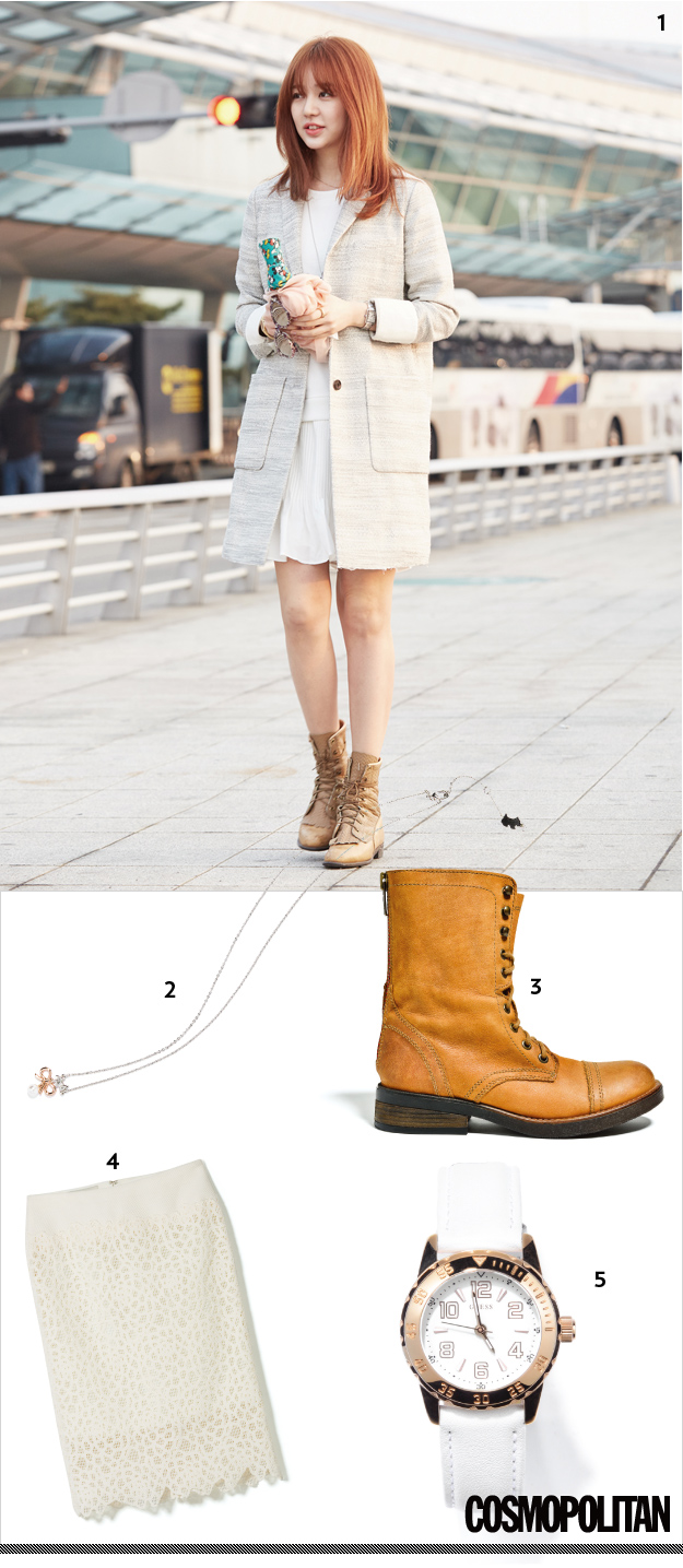 1. 윤은혜 여성스러운 원피스에 워커를 매치해 룩에 밸런스를 맞췄다 2. 16만8천원 게스 워치 3. 26만8천원 스티브 매든