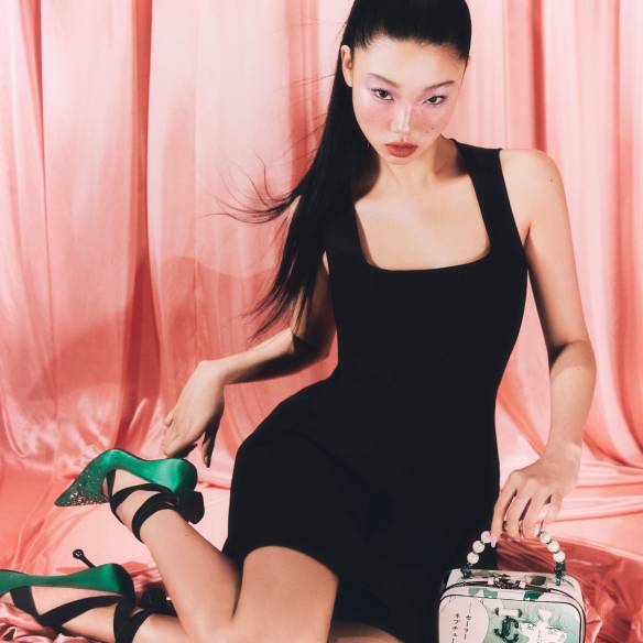 플라워 패턴이 오글거릴 땐 무채색 의상을 선택하는 게 해답. 톰브라운 의상에 파스텔 컬러의 힐을 더해 화사한 룩 완성!