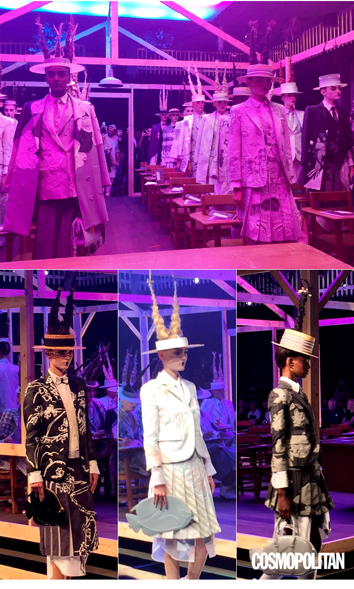 톰 브라운이 교복을 디자인 한다면 이런 모습이었을까요? 쇼가 시작되자 교실처럼 꾸며진 무대에 총총히 땋아 올린 헤어 스타일을 한 학생이 느린 걸음으로 등장했어요. 마치 동화 속 한 장면처럼 기묘한 분위기를 자아냈죠. 무릎 길이의 플리츠 스커트에 셔츠 드레스, 베스트, 재킷, 코트를 레이어링한 스쿨룩이 다양하게 선보여졌고 여기에 물고기 모양의 클러치, 일본의 게타를 연상시키는 신발을 매치해 독특한 상상력을 더했죠.