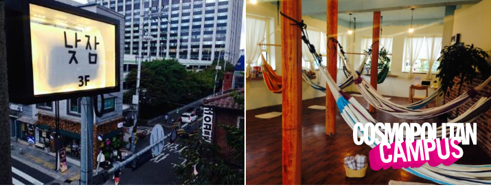 성균관대 근처에 숨어 있는 안락한 낮잠 공간! 이 곳에는 다양한 해먹들이 있어 사람들 눈에 구애 받지 않고 편하게 누워서 낮잠을 잘 수 있다. 게다가 따듯한 차도 준비돼 있으니 기나긴 수업으로 지쳤다면 당장 이 곳으로 고고싱.