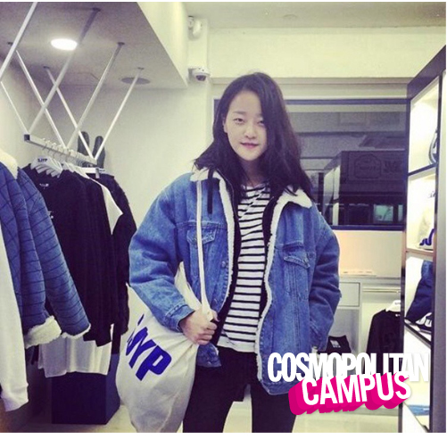 모델 강승현은 데님 셰르파 재킷을 멋스럽게 소화한 그녀.