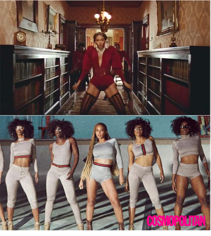 공개하자마자 화제가 된 포메이션 뮤직비디오. 뮤직비디오에선 보디 슈트를 직접 제작하기까지! 고혹적엔 레드 컬러의 보디 슈트에 샤넬 네크리스만 더해 섹시한 분위기를 완성했죠. 그런가 하면 구찌 로고가 새겨진 의상을 백댄서들과 똑같이 맞춰입고 칼군무를 선보이기도 했답니다.