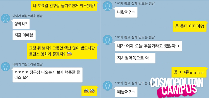 “ 다른 건 다 참을 수 있지만, 맞춤법 실수는 정말 견디기 힘들어요. 아무리 전에 그 남자에 대해 호감이 있었어도 맞춤법 실수하는 걸 보면 정이 뚝 떨어져요. 몇 년 전 썸남이 “친구들이랑 예기 많이 했어?”라고 물은 적이 있는데 그때 바로 썸을 끝내버렸었던 기억이 있어요! “ - 송연정 (가명, 대학생)