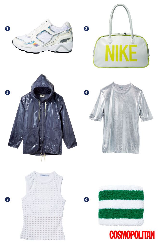 과감한 애슬레저 룩에 도전하고 싶다면 메탈릭 소재를 적극 활용하자. 스포츠 브라톱과 매시 소재의 티셔츠를 입고 반짝거리는 점퍼로 마무리하면 단번에 톡톡 튀는 룩 완성! 낙낙한 피트의 메탈릭 점퍼는 운동갈 때는 물론, 평소 캐주얼 룩에도 포인트 아이템으로 제격이니 지금 구입해도 후회 없을 듯.