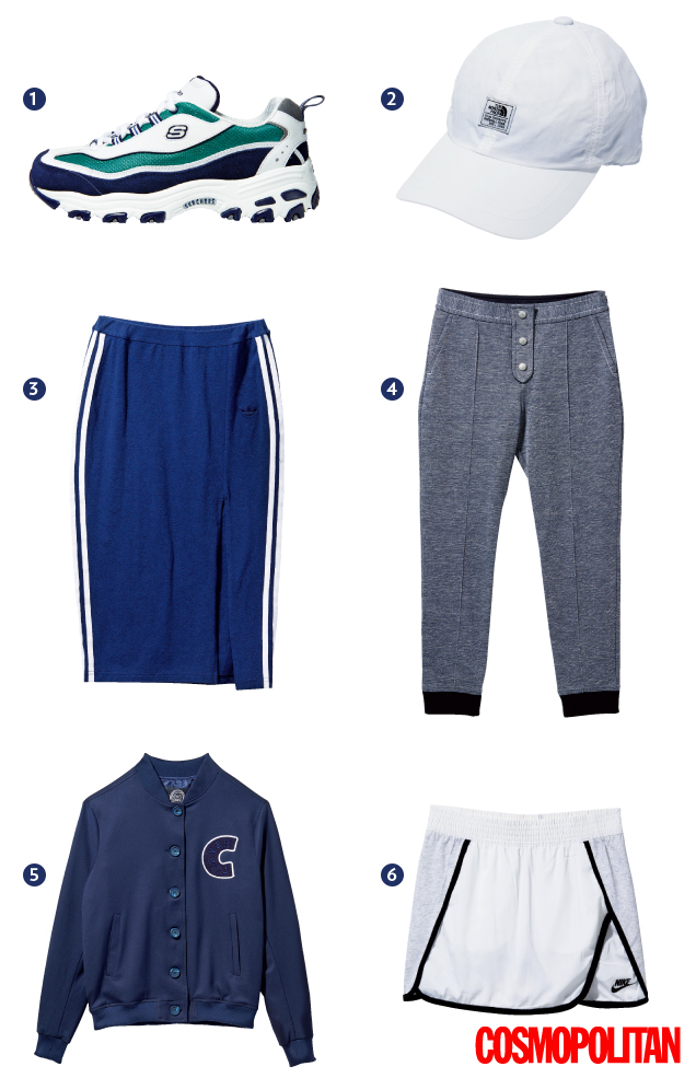 애슬레저 룩에 처음 입문한다면 베이식 아이템을 먼저 공략할 것. 스포티한 스웻셔츠, 깔끔한 화이트 티셔츠와 미니멀한 디자인의 바람막이 점퍼가 그것! 대신 스트리트 룩으로 활용할 때는 슬릿이 깊게 들어간 스커트, 경쾌한 포인트를 더하는 숄더백 등으로 반전의 재미를 주는 게 좋다.