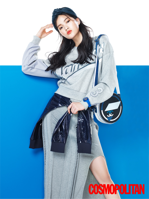 (사진)스웻셔츠 9만9천원 MLB. 스커트 1백20만원대 알렉산더 왕. 허리에 묶은 점퍼 35만원 노카오이 by 런투레스트. 헤어밴드 69만원대 제니퍼베어 by 반자크. 숄더백 가격미정 샤넬. 시계 14만원 아이스워치.