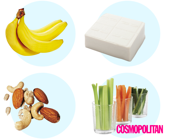 01 운동 후 꼭 챙겨 먹는 바나나. 운동으로 소진된 에너지가 빠르게 보충된다. 02 두부를 데운 뒤 살짝 데친 버섯을 올려 올리브 오일을 뿌리면 식사 대용으로 딱! 03 호두, 아몬드 등 견과류는 도시락에 넣고 입이 심심할 때마다 간식 대용으로 즐긴다. 04 제철 야채나 과일을 썰어 스틱으로 만든 뒤 도시락에 넣어 다니면 먹기 편하다.