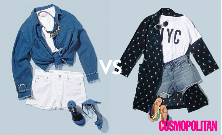 (왼) 데님셔츠 아이아이. 톱 프리마돈나. 쇼츠 갭. 목걸이 빔바이롤라. 뱅글 엠주. 샌들힐 슈콤마보니.