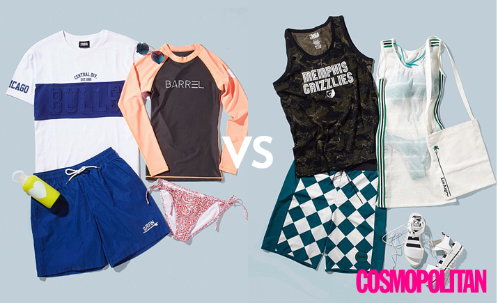 (왼) 남_티셔츠 NBA. 스윔팬츠 에잇세컨즈. 선글라스 마이클 코어스. 물통 BKR. 여_래쉬가드 배럴. 비키니 브리프 아메리칸 이글.