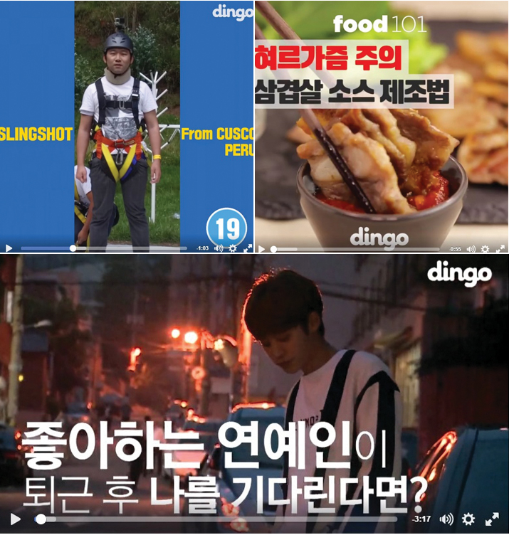 콘텐츠를 만들고, 다양한 플랫폼으로 유통하는 스튜디오 그룹이에요. 현재는 딩고 푸드, 딩고 트래블, 딩고 뮤직, 딩고 스타일, 남자들의 동영상, 스낵비디오 등 다양한 채널을 운영하고 있어요.
