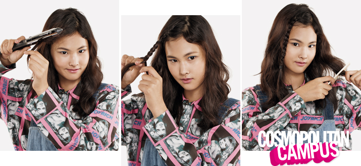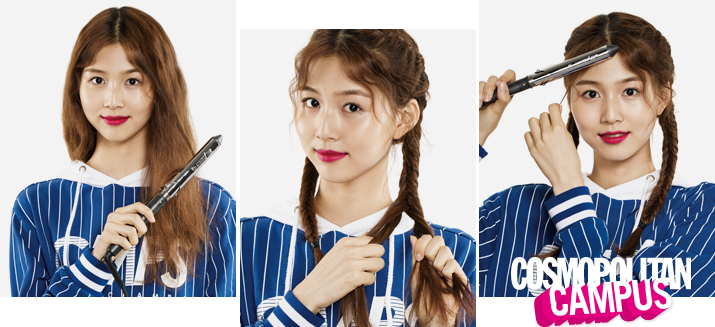 STEP 1 모발을 소량씩 잡은 다음 한쪽 방향으로 돌돌 만다. 머리를 땋을 때 서로 잘 얽힐 수 있도록 모발을 웨이비하게 만드는 과정이니 웨이브를 신경 써 예쁘게 말 필요는 없다.