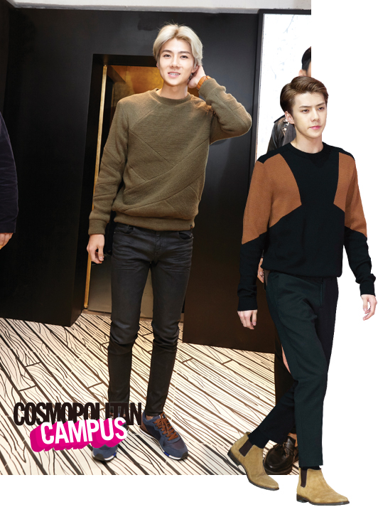 수많은 소녀 팬을 몰고 다니는 엑소 막내 세훈의 스타일을 한마디로 표현하자면 심플! 깔끔한 디자인의 스웨터나 스 셔츠에 블랙 슬랙스를 더해 가을과 잘어울리는 댄디남 스타일로 완성한다.