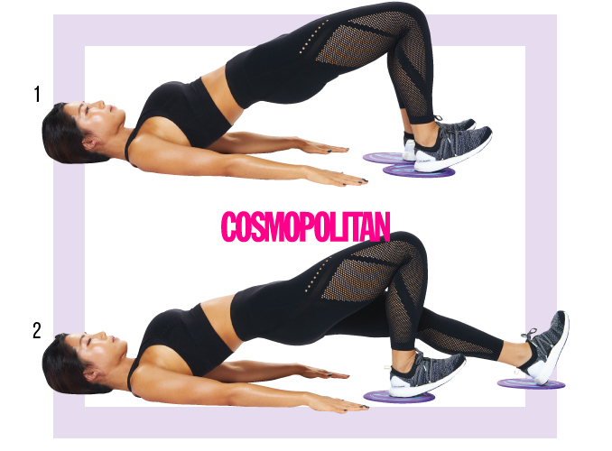 2 오른쪽 발끝을 세운 상태로 글라이딩 디스크를 뒤로 밀며 다리를 쭉 폈다가 다시 앞으로 끌어당겨 1번 자세로 돌아온다. 엉덩이가 조여드는 자극을 느끼며 운동하고, 어깨가 솟아오르거나 등이 굽지 않도록 주의할 것.