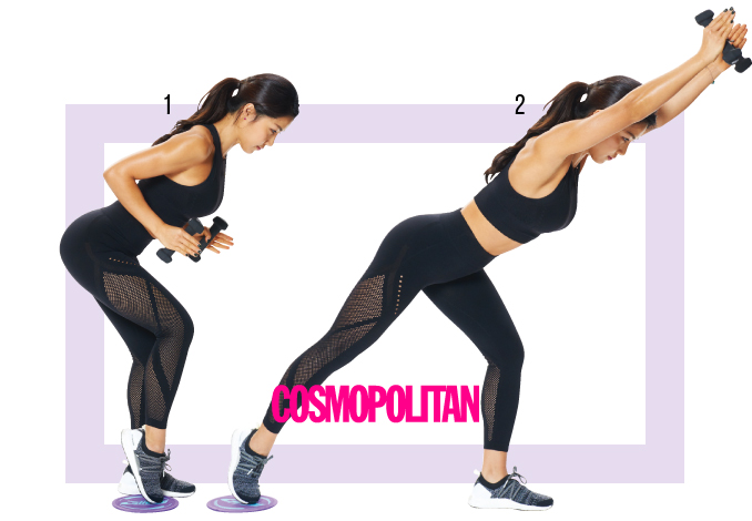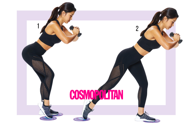양손에 덤벨을 쥐고, 양발을 어깨너비로 벌린 상태로 글라이딩 디스크를 밟고 선다. 그런 다음 왼쪽 다리는 45도 정도 구부리고, 오른쪽 다리는 대각선 뒤로 쭉 뻗는다. 동시에 상체를 숙이며 오른손으로 왼쪽 발끝을 터치한 다음 시작 자세로 돌아온다. 몸을 지지하는 왼쪽 무릎은 앞으로 구부리는 런지 동작을, 오른쪽 발은 스트레칭하듯 뒤로 쭉 뻗는다고 생각하면 된다. 반대편 다리도 동일한 방법으로 운동해 양쪽 다리를 1회씩 번갈아가면서 자극할 것.