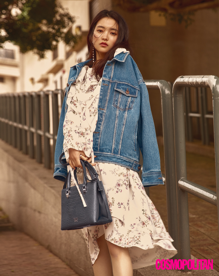데님 재킷, 드레스 각각 29만9천원 모두 나이스크랍. 백 49만8천원 사만사 타바사. 귀고리 4만3천원, 반지 4만2천원 모두 티에르.
