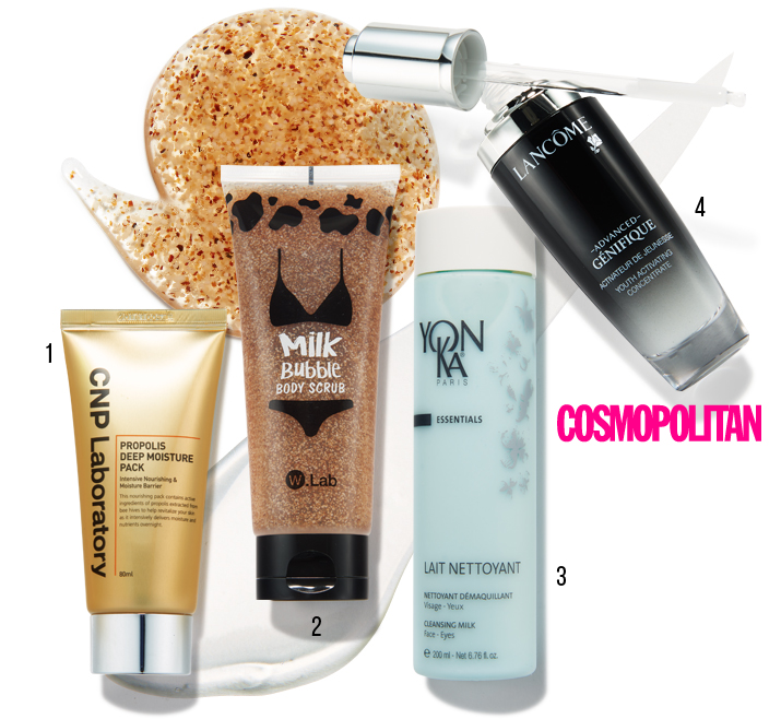 1 CNP 프로폴리스 딥 모이스춰 팩 3만2천원. 2 더블유랩 우유결스크럽 3만원.