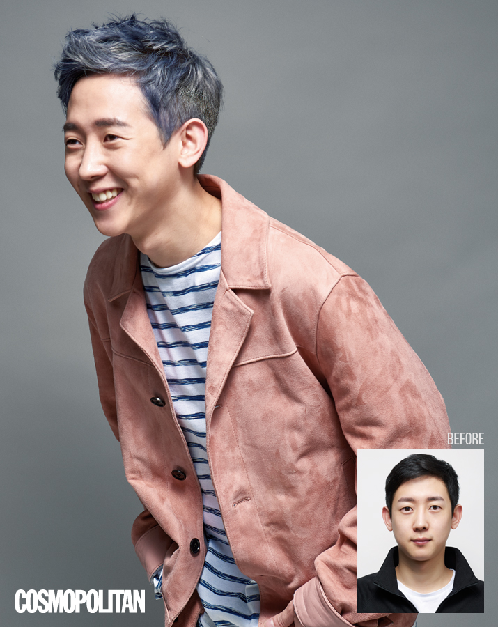 무엇을, 어떻게, 왜? “아무래도 남자들은 모발 색이 조금만 바뀌어도 이미지가 크게 달라 보이는 경향이 있어요. 갈색 머리 말고는 딱히 해본 적이 없고, 다행히 피부 톤이 밝은 편이라 이번 시즌 최강 트렌드 컬러인 애시 그레이로 염색을 진행했어요. 펌이나 염색 등의 시술을 전혀 하지 않은 버진 헤어라 두 번의 탈색 후에 컬러를 입혔습니다.” -순수도산본점 현묵 실장