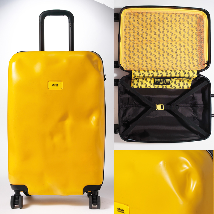 경쾌한 옐로 컬러가 시선을 강탈한다. 여기저기 손상이 간 듯한 구김 있는 디자인 덕분에 수하물 처리 시에도 걱정이 없다는 것이 장점이라면 장점. 멋스러운 로고 플레이가 특징인 내부의 디자인은 심플 그 자체다. 공간 분리형 지퍼와 고정 버클, 포켓이 끝! 복잡한 디자인을 지양하는 이들이라면 눈여겨볼 만하다.