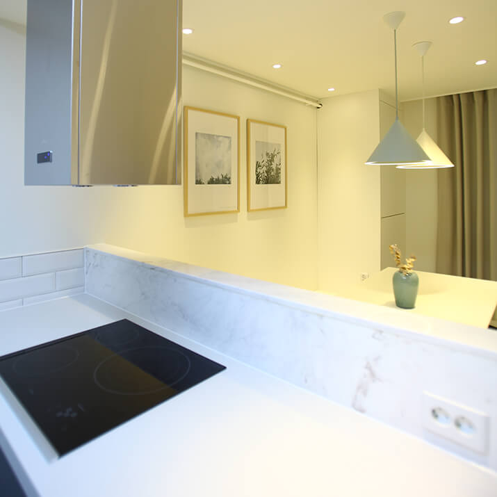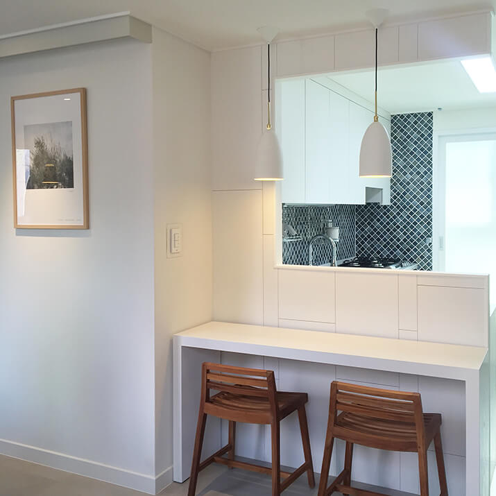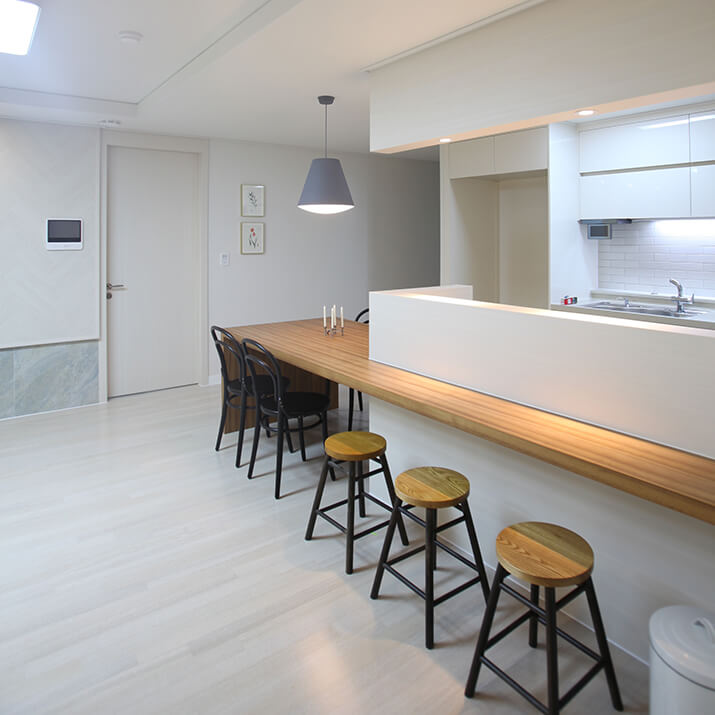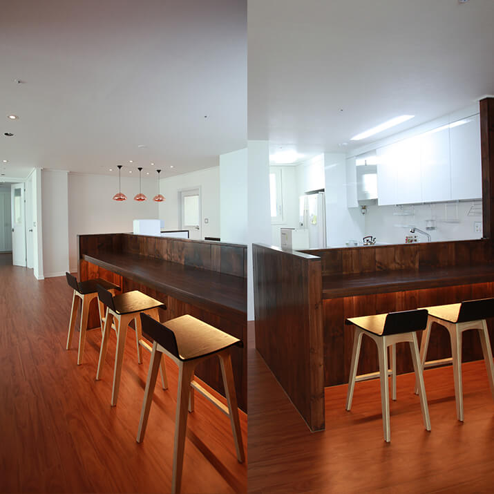 테이블 기능이 탑재된 반가벽 파티션은 주방 살림을 가려주면서 간식 테이블로 활용할 수 있어요. 일반 의자를 사용하는 높이, 바 의자를 사용하는 높이 등 두 가지 테이블 기능을 선택해서 탑재할 수 있죠. 편하게 노트북을 하거나 차 마시는 공간을 원한다면 일반 의자 높이에 맞춰 74~75cm 높이의 테이블을, 바 테이블로 활용하고 싶다면 90-100cm 높이의 테이블을 제작할 수 있죠. 좋아하는 라이프스타일에 맞춰서 제작하면 활용도가 훨씬 높아지겠죠.
