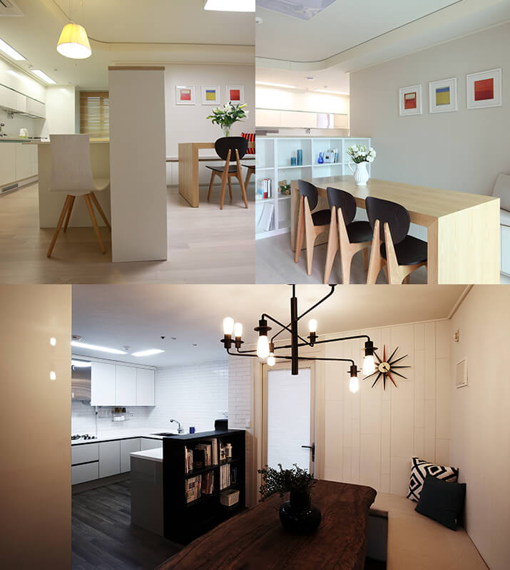 파티션과 일체형의 테이블도 활용도가 높지만, 공간에 따라 다른 종류의 분리형 식탁을 사용할 수 있어요. 분리형 식탁은 행여 공간을 다르게 쓰고 싶은 경우가 생길 때 자유자재로 이동시킬 수 있는 장점이 있죠. 고정된 테이블을 사용하면 이동이 불가능하니까요.