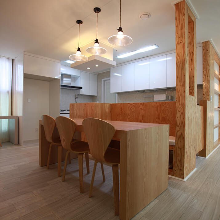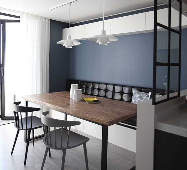 파티션에 벤치 의자의 기능을 더해보세요. 식탁 배치와 주방 동선이 더욱 재미있어질 거예요. 식탁으로 음식을 내거나 치울 때도 훨씬 편한 구조예요. 벤치 의자는 일반 식탁의자보다 더 여러 명 앉을 수 있어서 좋고요. 가끔 테이블에서 작업할 때 양반다리를 하거나 다리를 쭉 길게 펴서 앉을 수도 있겠죠. 요즘은 식탁이 밥만 먹는 곳만이 아니라 작업을 하거나 책을 보기도 하잖아요. 벤치형 의자 파티션은 주방의 쓰임을 높여주는 디자인이에요.