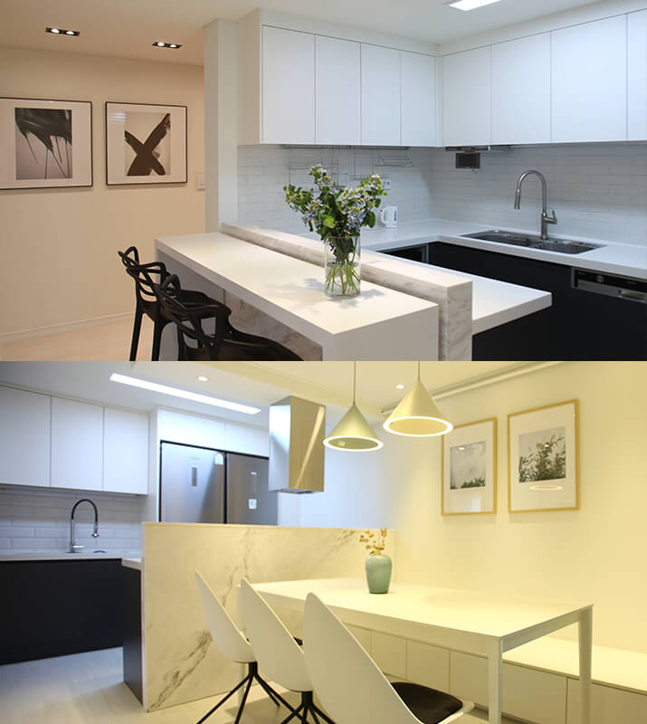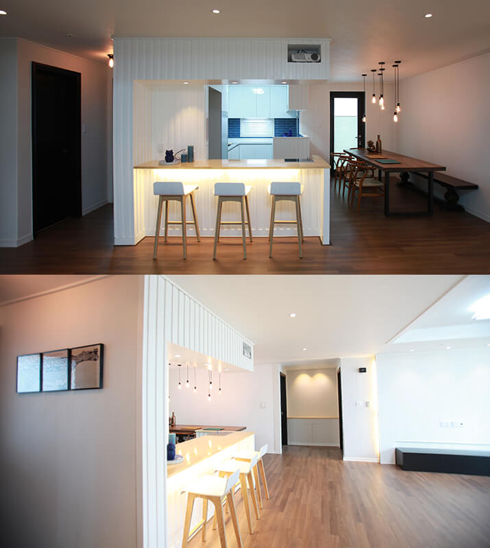 천장과 바닥을 디귿자로 연결하는 파티션은 좀더 유니크한 공간을 만들어줍니다. 카페와 같은 상업 공간에서 찾아볼 수 있는 파티션이에요. 여기에 적당히 간접조명을 심으면 더욱 특별해지죠. 특히 거실 쪽 아일랜드에 설치한 간접 조명은 은은하고 따뜻한 분위기를 연출한답니다.