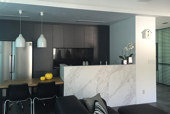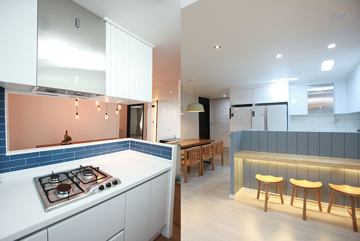새롭게 부엌 가구를 교체하면서 아일랜드에 파티션까지 고려해 제작한 부엌이에요. 주방 파티션의 소재가 같으면 매우 유연하게 공간을 분리시킬 수 있어요. 실패가 적은 디자인 노하우죠.