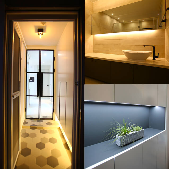 가구에 매립해 간접 조명을 넣으면 공간을 은은하게 만들어주고 가구가 있는 공간 전체를 특별하게 만들어준답니다. 화장실 거울이나 싱크대 상부장, 신발장 하단같이 우리생활에서 친숙한 공간에 간접등이 들어가면 그 아래에 어떤 오브제를 넣었을 때도 스팟 조명 효과처럼 돋보이게 해줄 수 있어요.