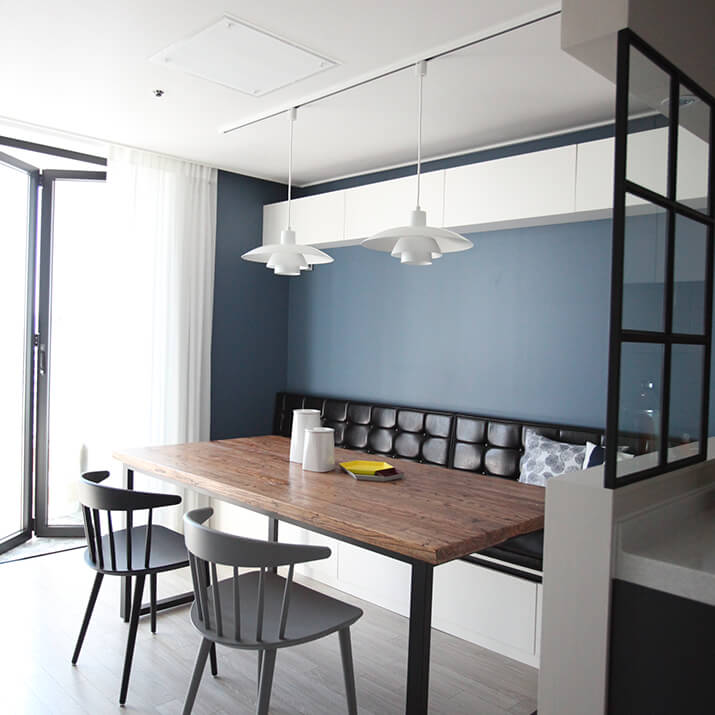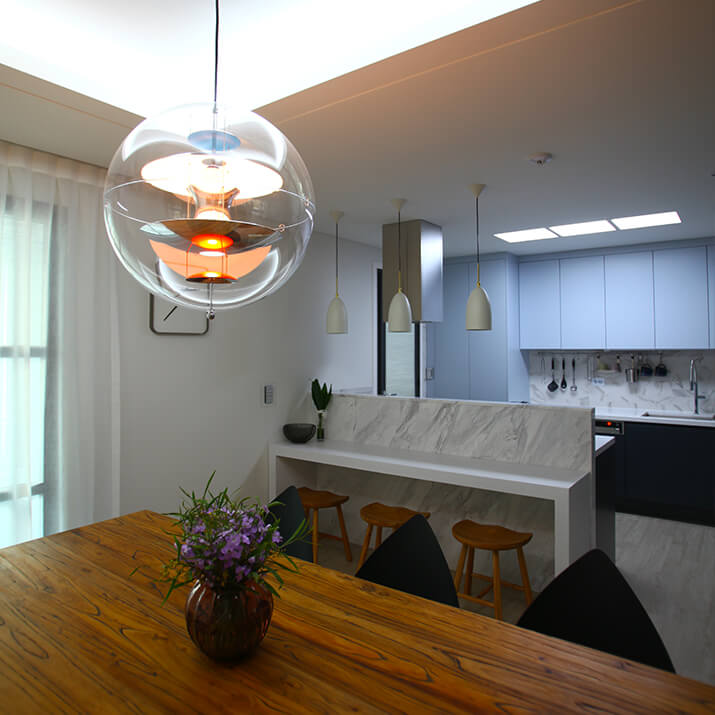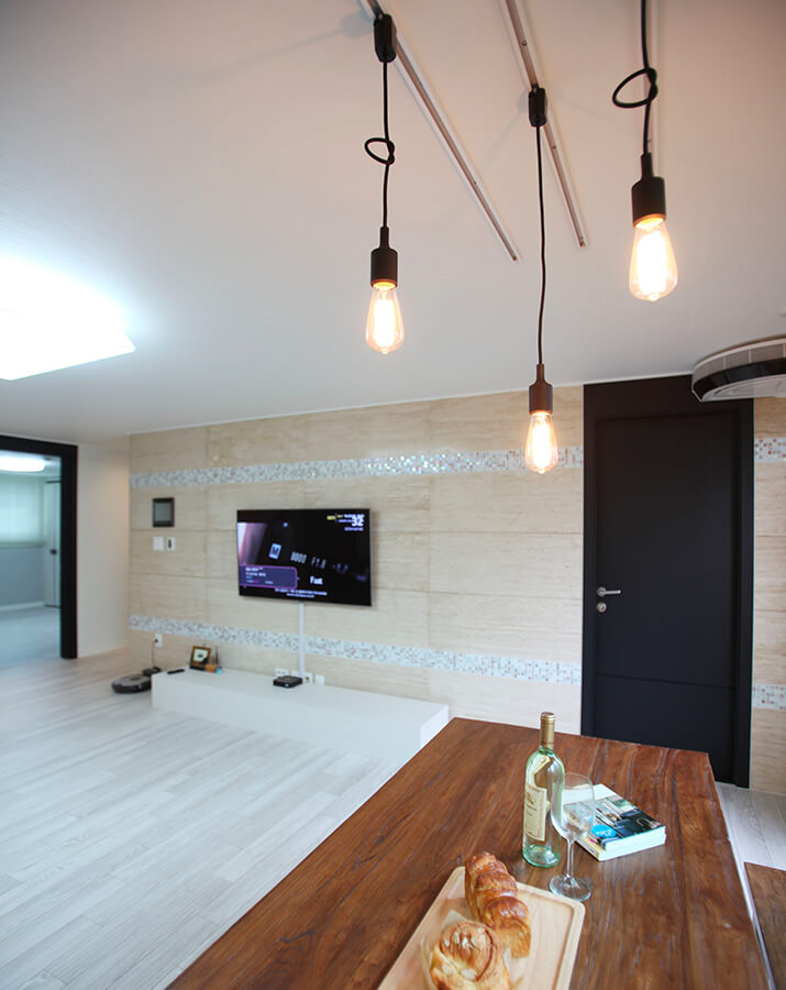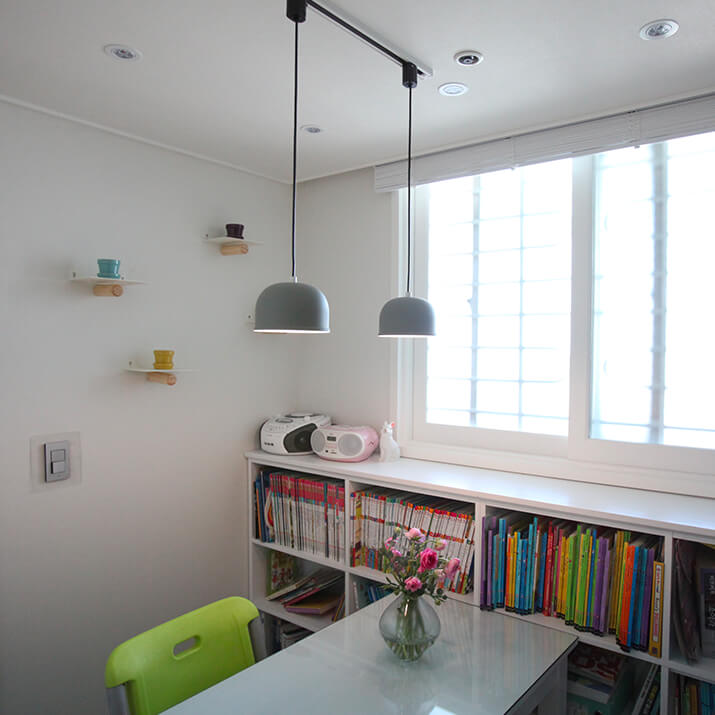 채 만원이 되지 않는 줄이 달린 펜던트 조명을 여러 개를 같이 설치해보세요. 단 개수가 많아서 조도가 너무 밝아질 때는 불이 들어오는 전구의 개수를 조절하는 방법도 있죠. 전구의 형태가 공간 디자인 포인트가 될 수 있으니, 소켓에 어떤 전구를 끼워 사용하느냐에 따라 색다른 연출이 가능해요. 꼭 비싼 디자이너 제품만이 능사는 아니라는 것, 소소하게 집 꾸미는 이들의 기쁨이죠.