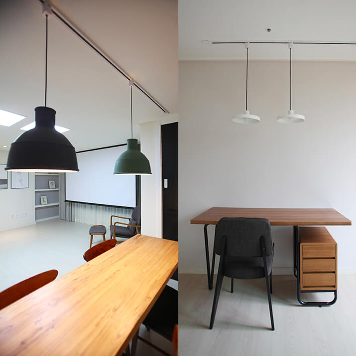 과거 레일 등은 주거 공간보다 주로 상업 공간에 사용되었어요. 레일의 장점은 램프의 탈부착이 가능해 램프 교체와 위치 변동이 쉽다는 점이죠. 집안 천장에 레일을 설치해 펜던트 조명을 달게 되면 공간 별로 다른 종류의 램프를 서로 바꿔 사용해볼 수 있어요. 책상이나 식탁 등 가구를 이동시킬 때 조명을 떼거나 이동시킬 수 있어서 좋죠. 엉뚱하게 덩그러니 조명만 달려있는 상황은 피할 수 있겠죠? 주거 공간에 다양하게 활용하고 변화를 주는데 큰 역할을 해줄 수 있어요. 레일 램프는 천장에 이미 설치되어 있는 조명 소켓들을 연결하여 별도로 설치할 수 있어요. 연결을 위한 부품들도 있고요. 꼭 공간 개조를 하면서 매립해 설치할 여건이 아니더라도 시도해볼 수 있는 아이템이죠.