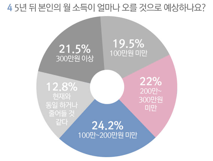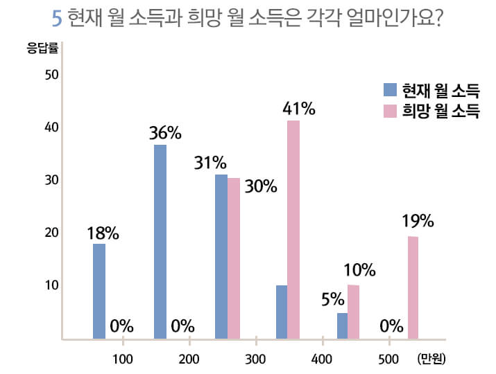 “소득을 높이기 위해 어떤 노력을 하는가?”란 질문에 총응답자의 47%가 “취업 및 이·전직을 통해 연봉을 높이려고 계획 또는 노력한다”고 답했다. “부업을 한다”거나 “주식 혹은 펀드에 가입한다”는 이들도 각각 23.3%, 12.1%를 차지했다.