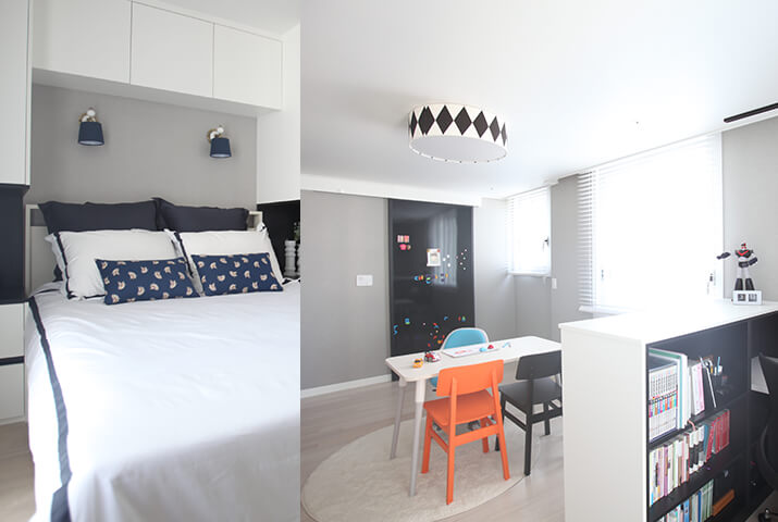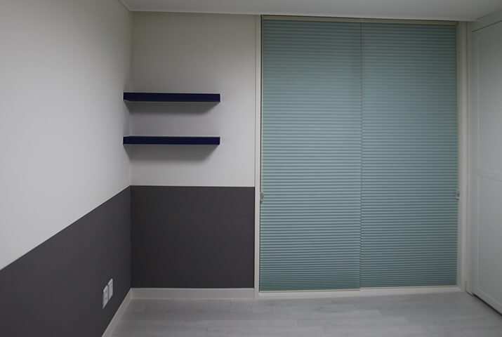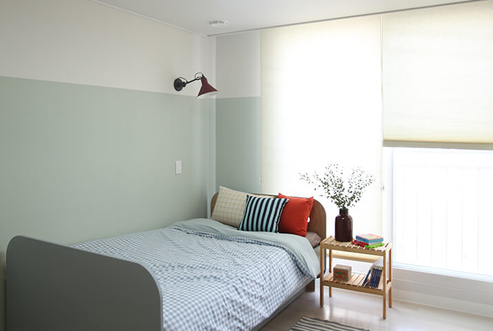 보통 벽 한 면을 다 채우는 방식으로 도배하지만, 면 분할을 고려해 시공할 수 있어요. 처음부터 면 분할에 대한 고민을 하고 시공하면 다채로운 컬러 벽을 완성할 수 있어요. 일반적으로 아파트같은 공동주택의 층고는 230~240cm를 넘지 않아요. 천장이 너무 낮아 보이지 않는 적정 위치에서 분할을 해주면 재미 있는 공간 연출이 가능하죠. 실크 벽지, 합지 벽지 등 판매되는 벽지들은 기본 규격이 정해져 있어요. 잘 계획하면 두 종류의 벽지를 사용하더라도 로스를 줄일 수 있죠. 제가 즐겨 시공하는 면 분할 팁을 공개하자면, 하부로부터 90~100cm, 상단으로부터 40~50cm 정도의 부분에서 절개 면을 만드는 것입니다. 안정감이 드는 위치예요. 분할 면에 맞춰서 선반이나, 조명, 가구를 설치해보세요. 일체감 있는 분할은 독특하고 절제된 공간을 완성할 거예요.