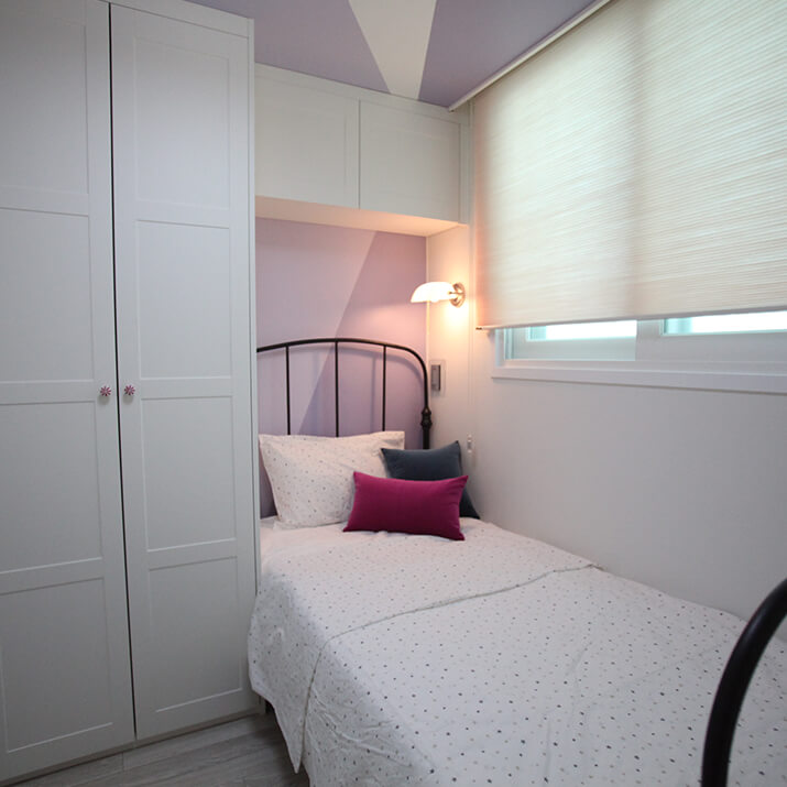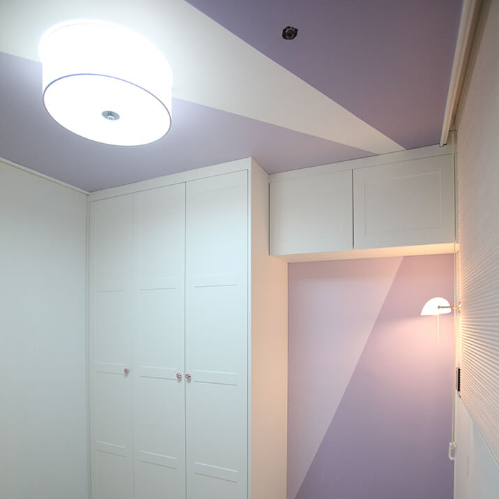 페인팅을 할때 기본적으로 그 벽 전체를 다 칠하는 것은 너무나 흔한 방법이죠. 독특한 나만의 개성을 위해 가로 또는 사선 절개선을 만들고 컬러도 다양하게 시도해보세요. 절개면을 어떻게 하느냐에 따라 분위가도 달라지고 공간이 더 넓어보이는 착시도 만들 수 있어요. 천정과 벽면까지 연결되는 페인팅 라인은 공간을 더 크고 화려하게 만들어줍니다.