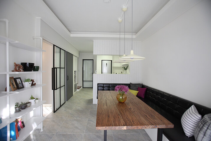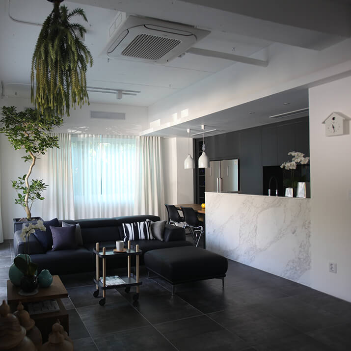 요즘 상공간에서 많이 볼수 있는 노출벽을 집안으로도 많이 들여놓고 있어요. 콘크리트 그 본연의 모습과 표면의 질감을 없애거나 감추지 않고 그 자체로 페인팅만으로 즐기는 겁니다. 높은 천정고를 그대로 사용할 수 있을 뿐 아니라 인위적이지 않고 자연스러운 분위기 연출에 효과적입니다.