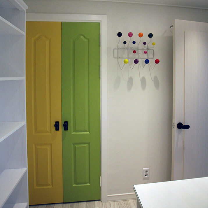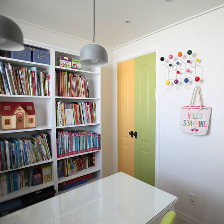 기존에 도장을 했던 문이라면 새것을 바꾸기 전에 페인팅을 고민해보세요. 문짝마다 다른 컬러는 개성있는 공간을 만들어주고, 한가지로 차분한 컬러를 쓰면 세련된 분위기를 만들 수 있어요. 요즘은 칠판페인트 같이 다양한 쓰임이 있는 페인팅들도 시중에 많이 나와 있어요. 방문 안쪽에 칠판 페인트를 칠하면 재미있는 공간을 만들어 볼 수 있어요.