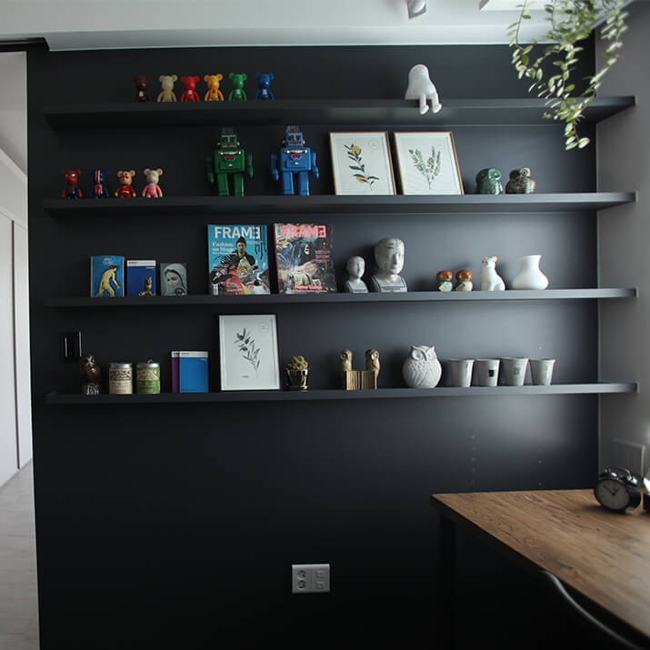 벽면에 페인팅을 하면서 선반이나 놓여질 오브제에 같은 컬러를 입히면 독특한 분위기를 만들 수 있습니다. 특히 선반엔 페인팅을 이용하면 컬러도 다양하게 넣을 수 있고 원할때마다 페인팅을 만들면 매번 새로운 느낌의 공간을 만들 수 있다는 장점이 있습니다.