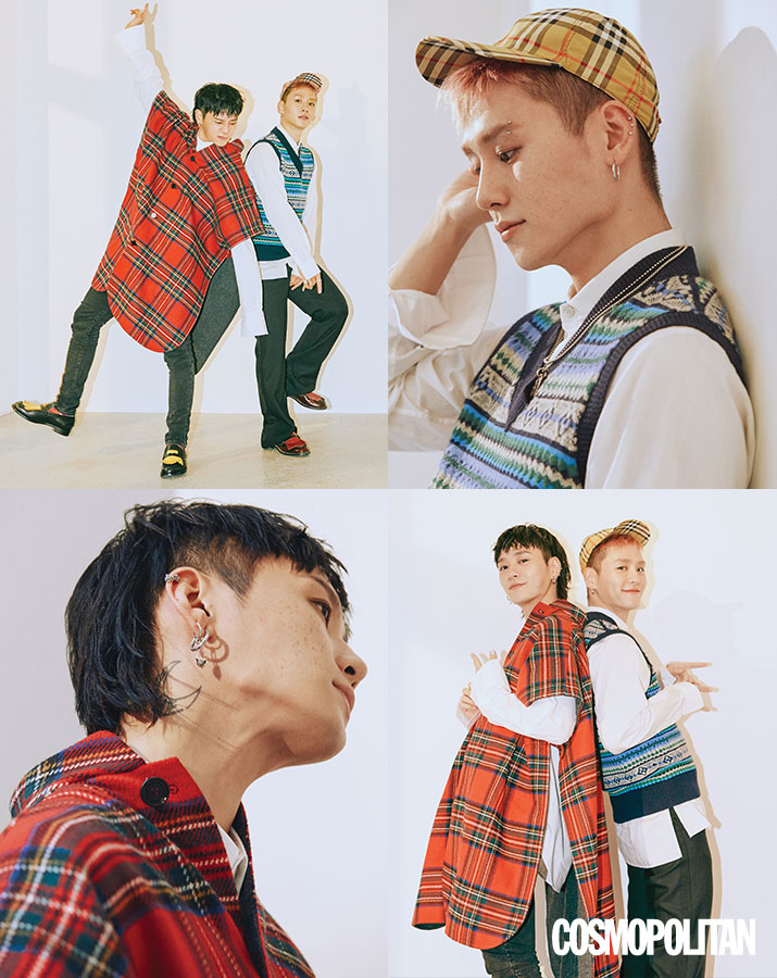 스튜디오에 음악이 흘렀고, 둘은 누가 먼저랄 것도 없이 리듬에 따라 몸을 움직였다. 그러곤 마주 앉자 대뜸 이렇게 말했다. “재미있었어요! 음악이 좋으면 촬영도 신나요.” 사랑스러운 이 둘은 3분 차이로 태어난 쌍둥이로 권영득이 형, 권영돈이 동생이다. 장난스럽게 굴다가도 춤 이야기가 나오면 “’유명하다’는 것과 ‘잘한다’라는 건 별개잖아요. 이름에 걸맞은 실력을 쌓고 싶어요. 자신 있거든요”라며 진중한 말을 쏟아낸다. 이들은 YG에서 10년 가까이 지낸 해외에서도 인정받는 댄서이자 안무가다. 입대를 앞두고 있지만 그 이후의 10년, 아니 그 이상의 시간이 더 기대되는 듀오다.