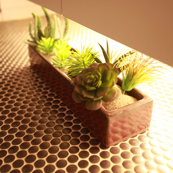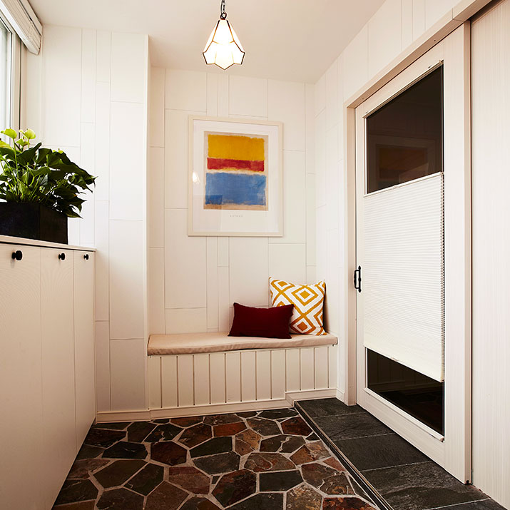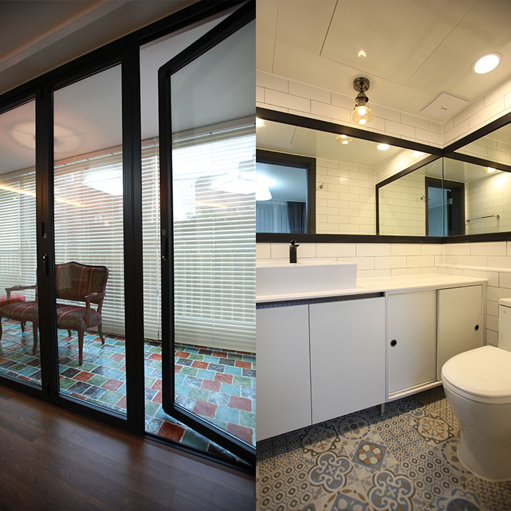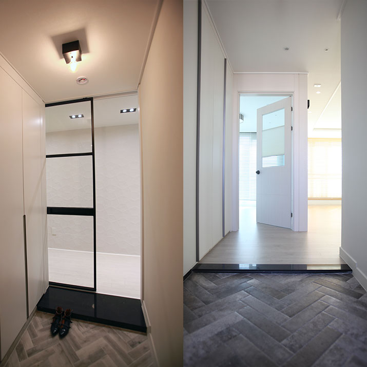 모자이크 타일을 쓸 때 바닥 쪽으로 간접 조명을 넣거나, 현관에 액자나 다른 오브제들을 잘 활용해보세요. 드나들 때마다 기분 좋게 다니실 수 있어요.