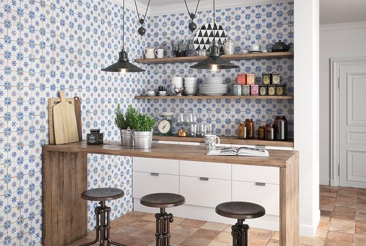 빈티지 타일의 힘을 보여주는 미람벨 타일로 시공한 사례. 블루와 브라운 패턴이 있다. 유로 세라믹