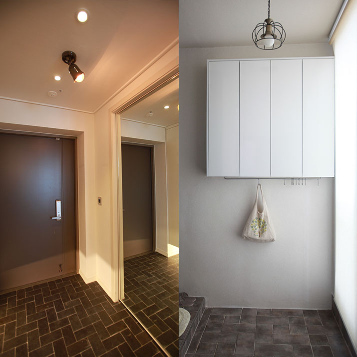 우리 집에서 외부에 제일 많이 드러나는 곳이 바로 현관이에요. 잠깐 배달로 오는 사람은 물론, 방문한 손님들이 제일 먼저 대면하는 장소가 현관이에요. 현관 바닥 타일을 고급스러운 패턴으로 시공하거나 석재 느낌의 따뜻한 타일을 연출해보세요.