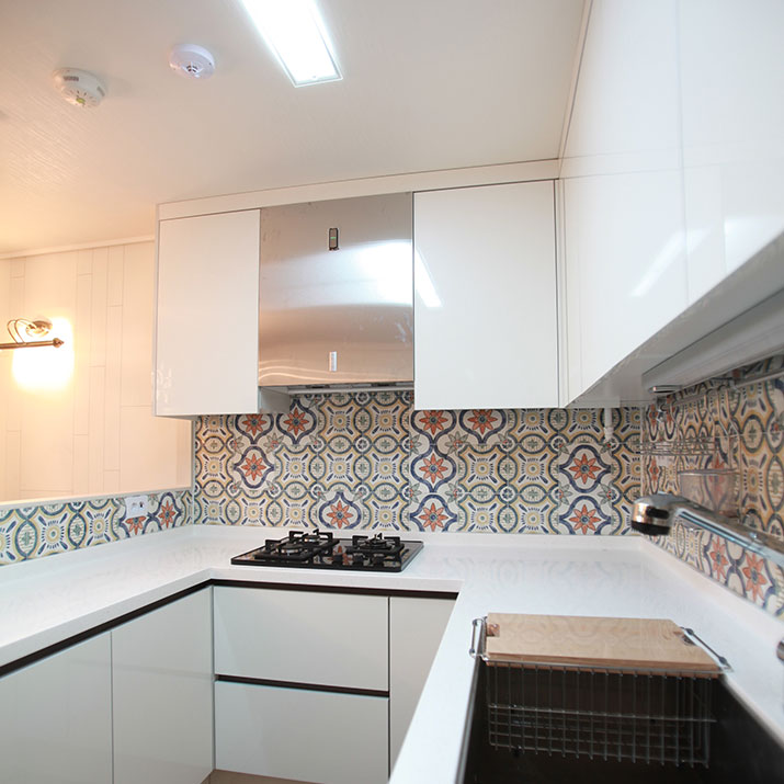 비비드한 컬러나 패턴 타일을 시공하면 공간에 확실한 포인트가 됩니다. 이때 바닥 포인트 시공과 마찬가지로 주변을 심플하게 한 톤으로 정리해주는 것이 포인트 타일을 돋보이게 할 수 있어요.