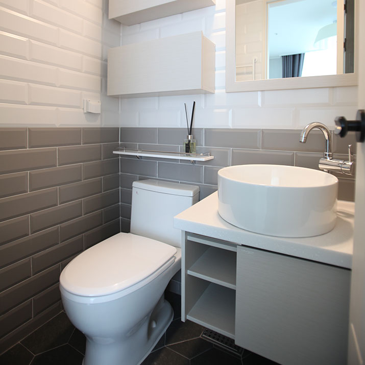 화장실 욕조 하단도 타일로 시공하면 훨씬 고급스러운 느낌을 만들 수 있어요.