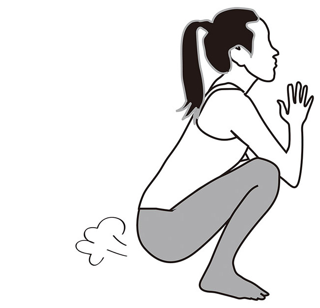 다리를 M자 자세로 앉았다 일어났다를 천천히 반복한다. 스쿼트를 할 때보다 조금 더 깊게 앉아야 하며, 하체 반동과 외괄약근을 이완시키면서 가스를 배출시킨다. 양변기를 이용할 시 받침대 위에 다리에 두어 쪼그려 앉아도 방귀 뀌는데 도움이 된다.