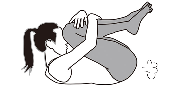 바르게 누운 상태에서 다리를 모아 손으로 감싼 후, 가슴까지 끌어당긴다. 부드럽고 길게 호흡하며 골반이 바닥과 떨어지지 않게 2~3분정도 자세를 유지한다. 이 자세는 장이 강한 자극을 받아 가스를 방출하는데 도와준다.