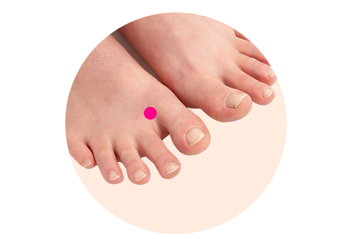엄지 발가락과 둘째 발가락 뼈가 만나는 점에서