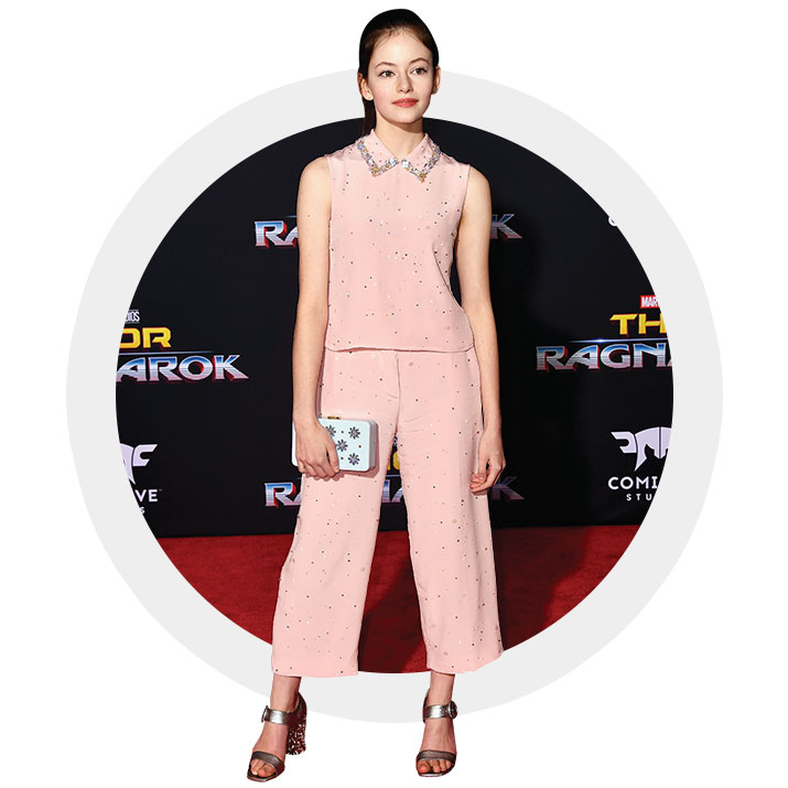 미우미우의 벚꽃빛 슬리브리스 톱과 와이드 팬츠를 입은 배우 매켄지 포이.